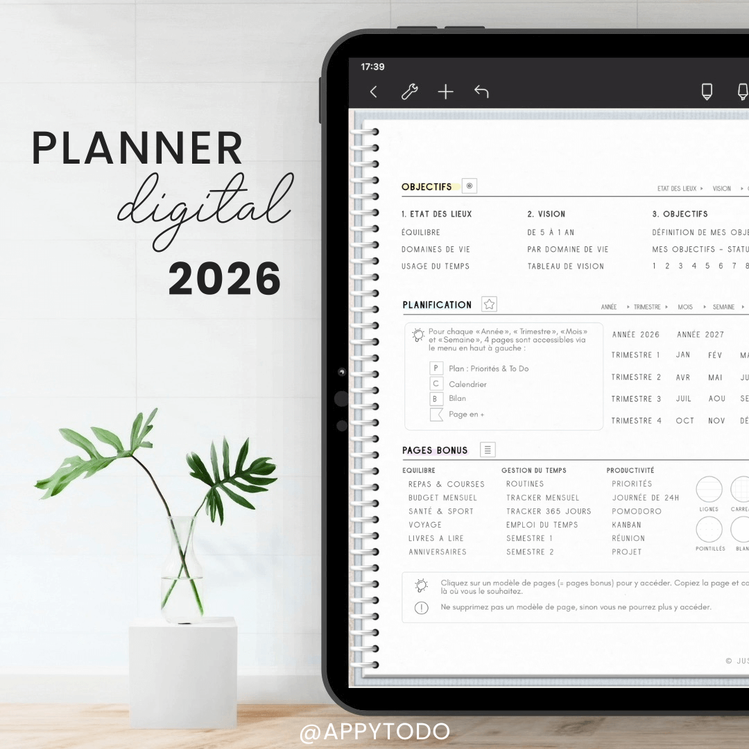 Compatible avec la plupart des applications d’annotation (ex: Noteshelf, Goodnotes, Notability, Samsung Notes, Penly, Xodo…), ce planner digital français a été conçu pour être utilisé sur une tablette ou un iPad avec un stylet.